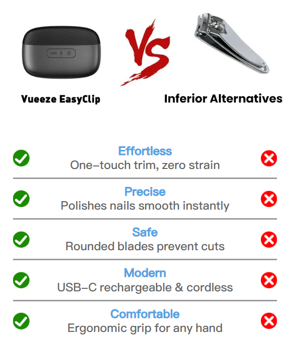 Engineered with podiatrist-inspired precision, Vueeze EasyClip powers through thick, curved, or hardened nails in seconds—no force required.